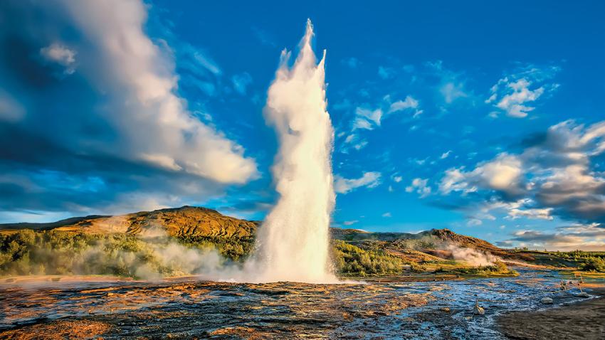 Az élmény után folytatódik az „éltető víz” felfedezése: a Gullfoss-vízesés 32 méteren zúdul alá, hatalmas erejével lenyűgözve látvány tárul elénk. Míg a Nagy Gejzír évtizedenként egyszer tör ki, „kistestvére”, a Strokkur annál aktívabb: pár percenként akár 20 méter magas vízoszlopot lövell a levegőbe. Ezután visszatérés a hotelbe.