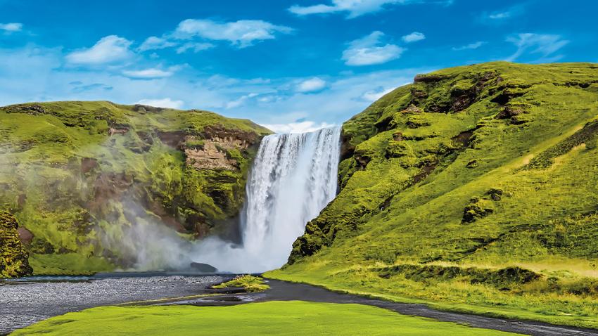 A vulkánok között bukik alá a Skógafoss-vízesés, amely 60 méteres mélységbe zuhan, és vízpárával árasztja el az odalátogatókat. Ezután kitérőt teszünk a Sólheimajökull gleccsernyelvhez (kedvező időjárás esetén). Kontrasztként feltárul előttünk a híres Reynisfjara fekete lávapart, amelyet szögletes bazaltoszlopok díszítenek. Ezután visszatérés a hotelbe.